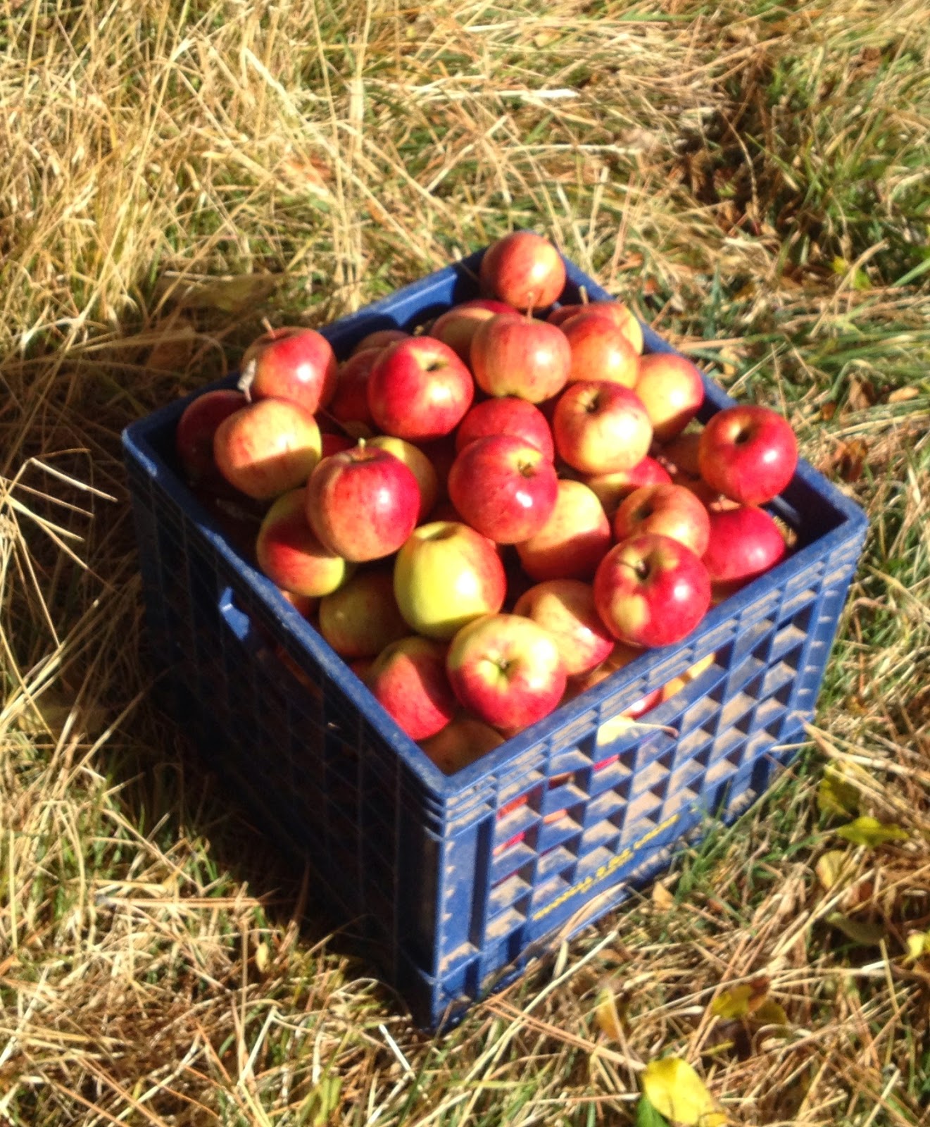 Today I was invited along to pick the remaining apples as winter is moving in this weekend. I fashioned a Wal-mart go green bag around my neck with a bungee strap as a makeshift apple picking contraption. I carefully positioned the ladder below so that when I climed to the top rung; I would be in prime position to reach as many apples as possible in that section.